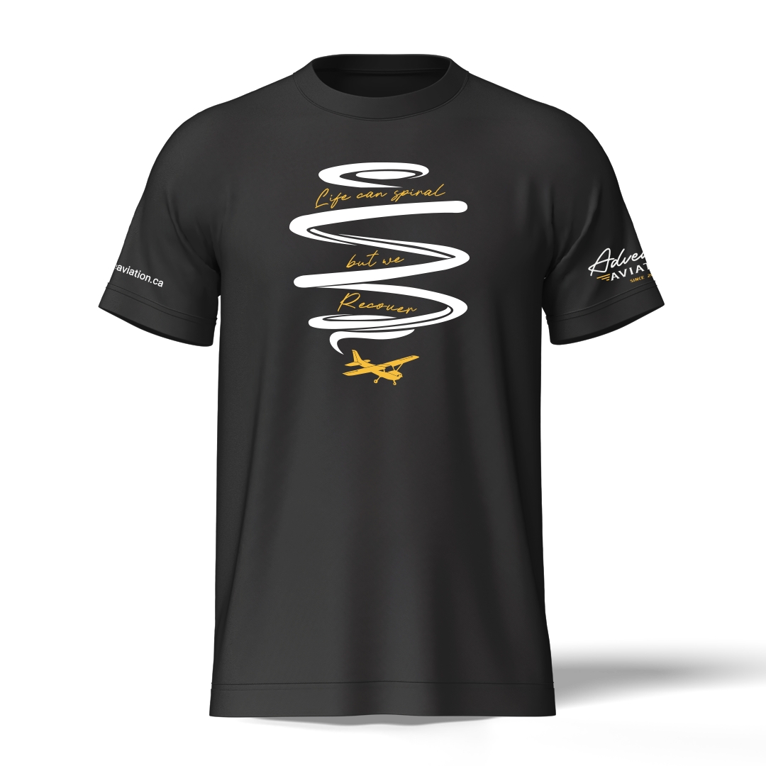 The Life Can Spiral… But We Recover shirt blends aviation meaning with a message that goes beyond the cockpit. Featuring a clean spiral-inspired design, handwritten-style text, and a small aircraft graphic, this tee captures the emotional and technical side of flight in one simple, memorable statement.